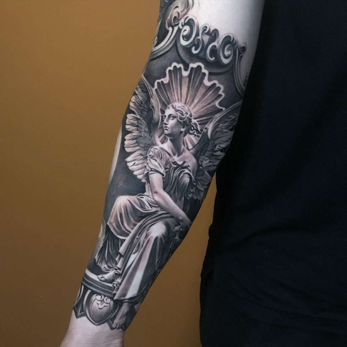 Norwegian tattoo artist and co-owner of the Dropout Collective in Copenhagen, Ruben Langsted creates black and grey work inspired by classic art and architecture.