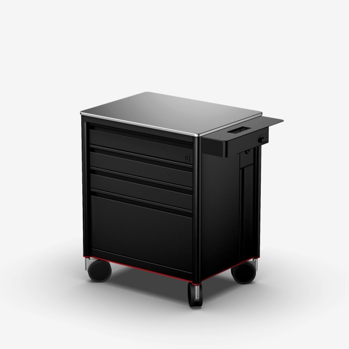 Ma dużą pojemność: jedną dużą szufladę o wysokości 33 cm na duże przedmioty, trzy mniejsze i jedną z boku, która może pomieścić do 108 butelek z farbami. Cztery szuflady z przodu można dostosować do własnych preferencji. Gładki blat jest wystarczająco duży, aby pomieścić wszystko, czego potrzebujesz i jest łatwy do czyszczenia. Cztery gniazda elektryczne i 2 porty USB zasilą cały sprzęt do tatuażu. Stacja robocza Meta jest całkowicie wykonana z aluminium.