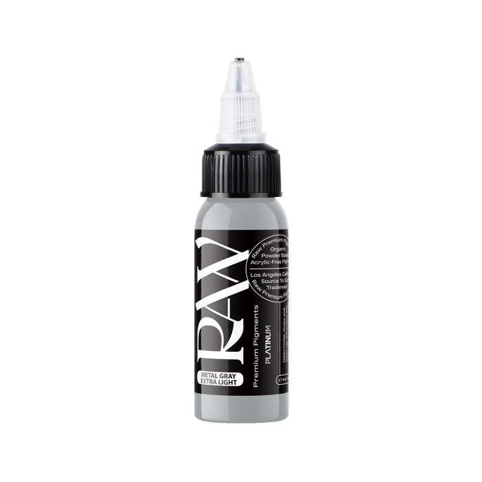 Metal Gray Extra Light to bardzo subtelny w odcieniu, nieprzejrzysty szary tusz do tatuażu, który można przyciemniać lub rozjaśniać i łatwo wnika pod skórę; pochodzi ze zgodnej z unijnym rozporządzeniem REACH linii tuszów Platinum od Raw Premium Pigments.