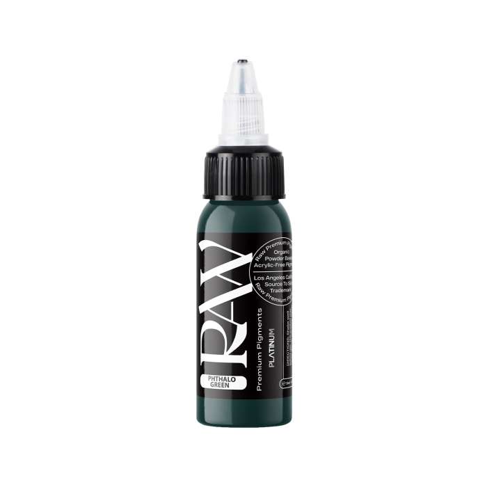 Phthalo Green to głęboki, ciemnozielony tusz do tatuażu ze zgodnej z unijnym rozporządzeniem REACH linii tuszów Platinum od Raw Premium Pigments.