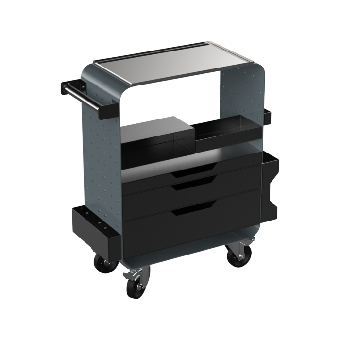 - Górny blat roboczy wykonany z łatwej do czyszczenia i trwałej, polerowanej stali nierdzewnej, wyposażony w rant dla ochrony sprzętu i akcesoriów