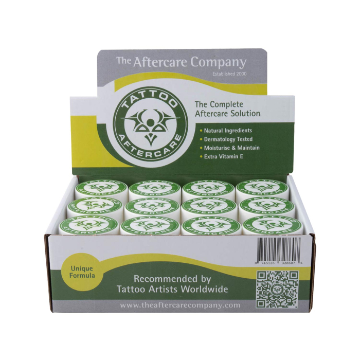Balsam pielęgnacyjny Tattoo Aftercare® produkcji The Aftercare Company to pierwszy na rynku produkt do pielęgnacji tatuaży o potrójnym działaniu, którego zadaniem jest zmiękczać i nawilżać skórę, a także przedłużać dobry wygląd tatuaży. Kompleksowy preparat pielęgnacyjny polepszy i pomoże utrzymać wyrazistość i czystość tuszu pod skórą, ochroni głębię czerni, a barwnym tuszom doda blasku. Używany na gotowe, zaleczone tatuaże, odżywi i odnowi skórę, pomagając w ten sposób odzyskać blask także starszym tatuażom. Produkt Tattoo Aftercare® zdobył jako pierwszy w historii złoty medal przyznawany przez organizację Cruelty Free International (wcześniej: BUAV), ponieważ wykorzystuje w 100% naturalne składniki oraz jest wolny od parabenów, konserwantów, produktów ropopochodnych, alkoholi i barwników klasy spożywczej. Jego formuła opiera się na wyjątkowej mieszance lawendy, olejku herbacianego i niaouli, jest bogata w witaminy A, D i E i została opracowana tak, aby redukować ryzyko powstawania strupów i swędzenie, nawilżać i łagodzić skórę oraz przyspieszać proces gojenia, jednocześnie utrzymując blask umieszczonego pod skórą tuszu.